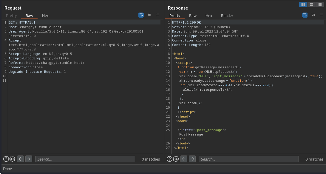 Burpでリクエストを見ると、/post_messageに入力したmessageが送られています。